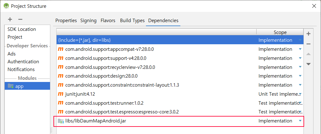 - 라이브러리도 http://apis.map.kakao.com/android/guide/에서 받으면 된다.