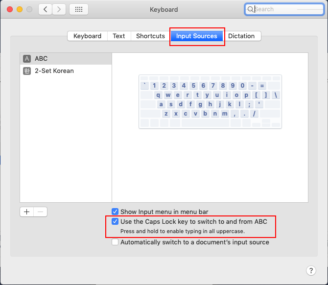 2. Input Source -> Use the Caps Lock Key to switch to and from ABC 체크