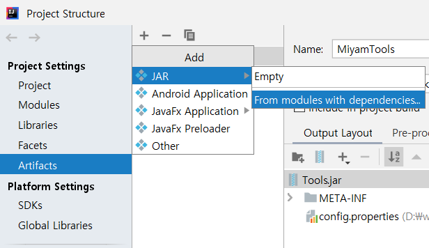 2. Project Settings - Artifacts - + - JAR - From modules with dependencies 클릭