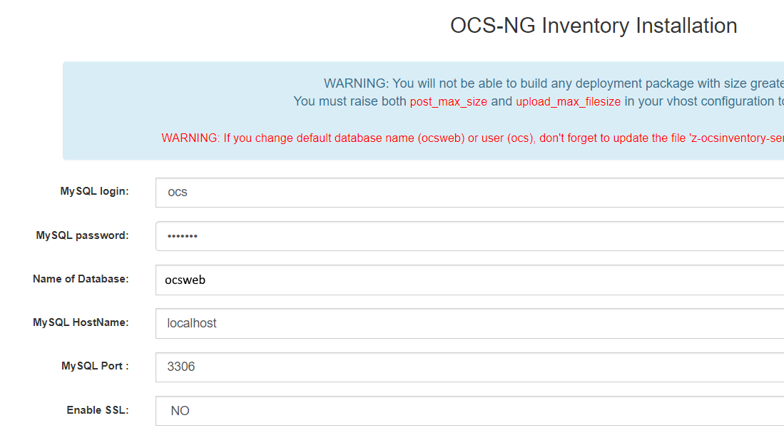 - http://IP/ocsreports/install.php 로 웹브라우저로 접속 후 정보 입력